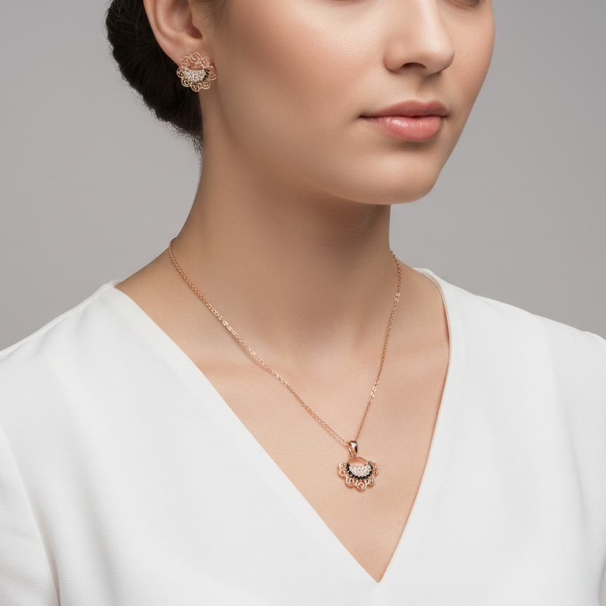 A delicate bloom in warm rose gold, glowing with refined sparkle. Timeless beauty, pure luxury.